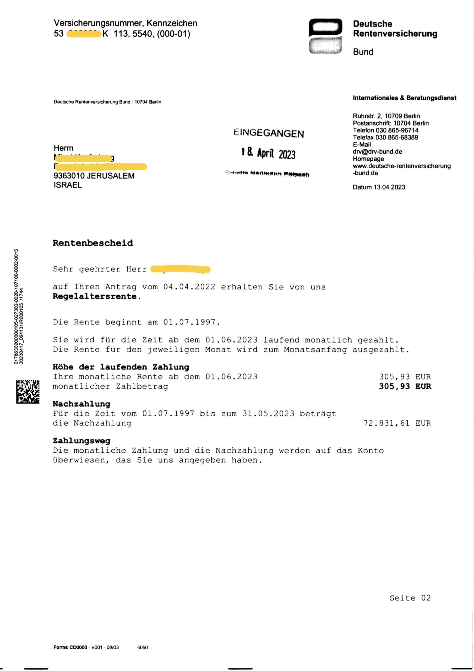 מצורף האישור שהתקבל מהביטוח הלאומי הגרמני. הפרטים המזהים של הניצול נמחקו, כדי לשמור על פרטיותו.