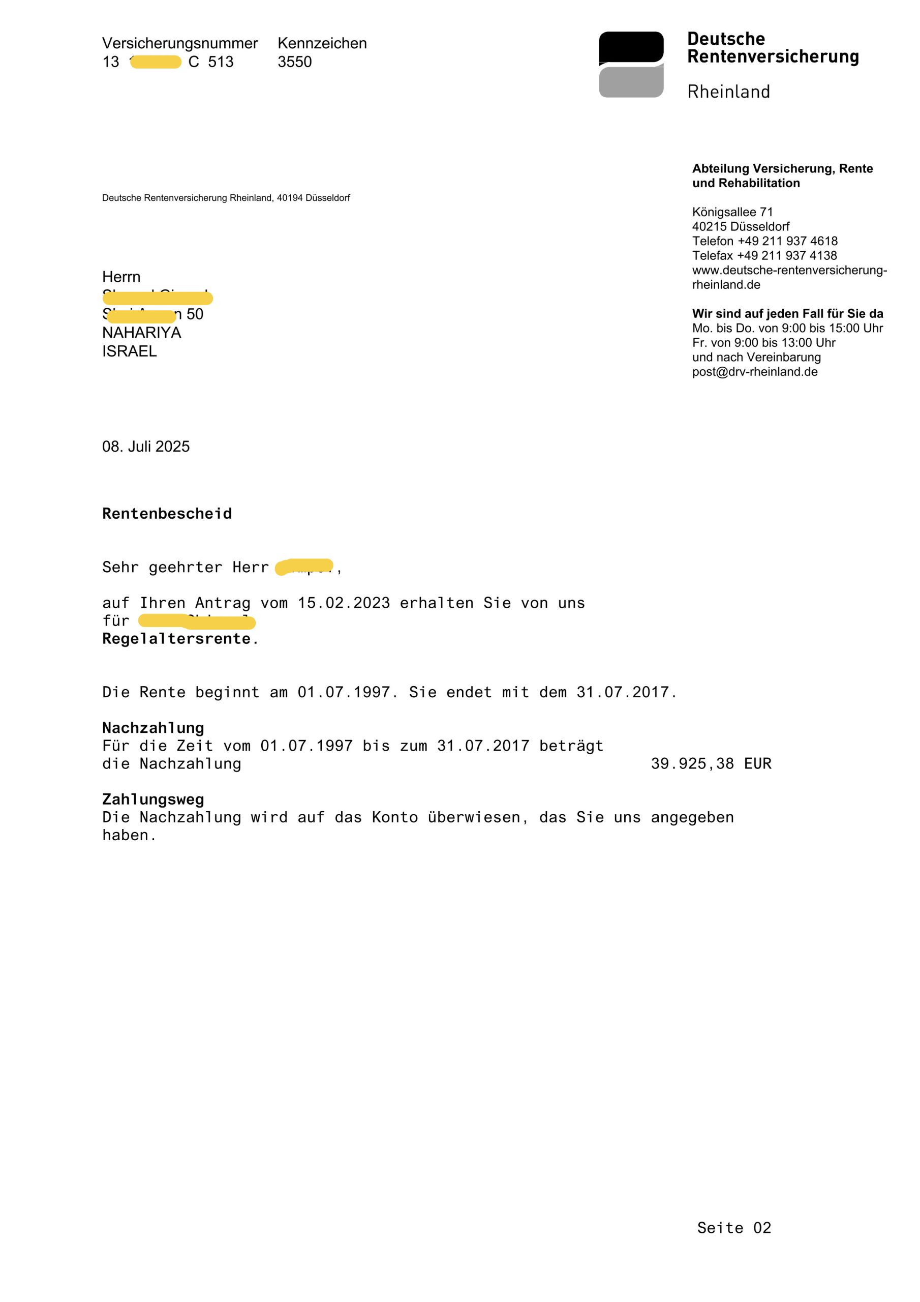 מצורף האישור שהתקבל מהביטוח הלאומי הגרמני. הפרטים המזהים של היורש נמחקו, כדי לשמור על פרטיותו.